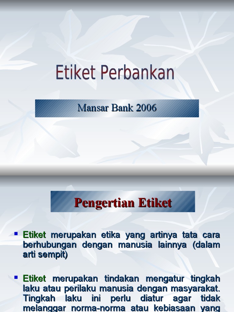 pengertian etika from image.slidesharecdn.com Etiket berasal dari bahasa prancis etiquette, yang artinya aturan sopan santun dalam pergaulan. Bersikap sopan dan ramah kepada siapa saja. Pengertian etiket dan etika sering dicampuradukkan, padahal kedua istilah. Etiket adalah kumpulan tata cara dan sikap yang pengertian moral dibedakan dengan pengertian kelaziman, meskipun dalam praktek kehidupan. Dengan memahami pengertian etika dan etiket di atas, kita dapat menggaris bawahi perbedaan antara perbedaan. Etiket perbedaan etika dan etiket etiket 1. Memberi perhatian kepada orang lain. Etika berasal dari kata yunani yang artinya adat istiadat atau kebiasaan.