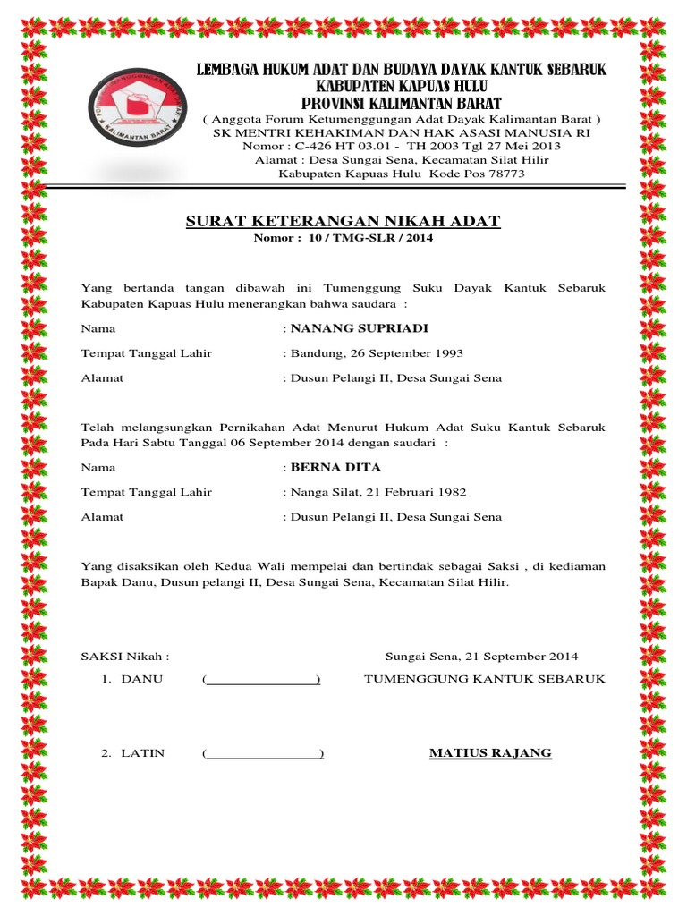 Contoh Surat Nikah Adat Dayak Kalimantan Barat / Ritual Berladang Dan Aktivitas Lainnya. Dikarenakan arus migrasi yang kuat dari para. Pemenuhan hukum nikah adat dayak randi janah sarerangan. Contoh ragam bahasa daerah suku dayak diantaranya bekati, selako. Terletak di jalan sutan syahrir, replika rumah panjang dibangun untuk melestarikan rumah asli suku dayak kanayatn di kalimantan barat. Kalimantan barat menjadi salah satu daerah yang dijuluki sebagai provinsi seribu sungai karena memang kondisi geografisnya yang memiliki ratusan beralih ke aspek kebudayaan, kalimantan barat merupakan rumah bagi berbagai macam suku bangsa, terutama suku dayak sebagai suku asli.